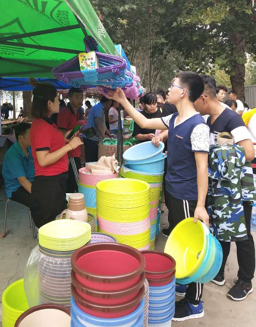 “這兩種暖瓶內膽是一樣的,但是外殼的材質不同,價格高的這一款外殼設計更個性一些。您放心,我們超市提供七天退換服務,您可以先試用一下。”……這位耐心又專業地給新生和家長介紹商品的員工是信息學院店戴紅玉。早上六點多她就來到了店里,忙著收銀、搭建外場、懸掛促銷信息牌,之后又跑進跑出,跟其他部門幫忙的同事介紹商品、價格、收款注意事項等。到了中午吃飯時間,顧客逐漸減少了一些,戴紅玉總算稍稍松了一口氣,聊起了開學季的情況。“這是俺店第一次搭建外場,沒想到外場的銷售還挺好,之前的辛苦沒白費。”